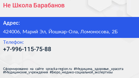 Не Школа Барабанов по адресу 424006, Марий Эл, Йошкар-Ола, Ломоносова, 2Б в дальнейшем Организация, размещена в следующих категориях: