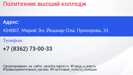 Политехник, высший колледж по адресу 424007, Марий Эл, Йошкар-Ола, Прохорова, 31 в дальнейшем Организация, размещена в следующих категориях: