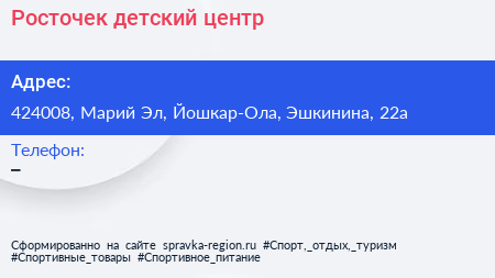 Росточек, детский центр по адресу 424008, Марий Эл, Йошкар-Ола, Эшкинина, 22а в дальнейшем Организация, размещена в следующих категориях: