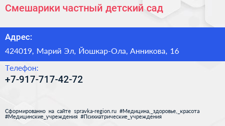Смешарики, частный детский сад по адресу 424019, Марий Эл, Йошкар-Ола, Анникова, 16 в дальнейшем Организация, размещена в следующих категориях: