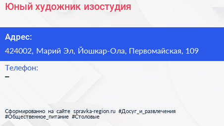 Юный художник, изостудия по адресу 424002, Марий Эл, Йошкар-Ола, Первомайская, 109 в дальнейшем Организация, размещена в следующих категориях: