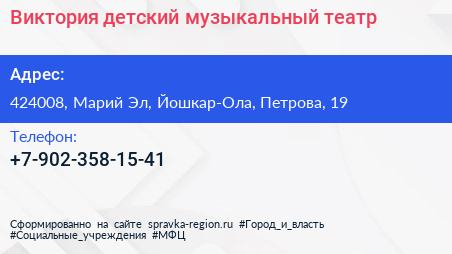 Виктория, детский музыкальный театр по адресу 424008, Марий Эл, Йошкар-Ола, Петрова, 19 в дальнейшем Организация, размещена в следующих категориях: