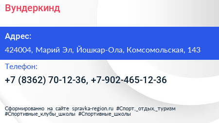 Вундеркинд по адресу 424004, Марий Эл, Йошкар-Ола, Комсомольская, 143 в дальнейшем Организация, размещена в следующих категориях: