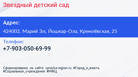 Звездный, детский сад по адресу 424002, Марий Эл, Йошкар-Ола, Кремлёвская, 25 в дальнейшем Организация, размещена в следующих категориях: