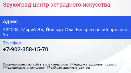 Звукоград, центр эстрадного искусства по адресу 424033, Марий Эл, Йошкар-Ола, Воскресенский проспект, 9а в дальнейшем Организация, размещена в следующих категориях: