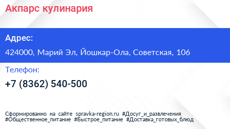 Акпарс, кулинария по адресу 424000, Марий Эл, Йошкар-Ола, Советская, 106 в дальнейшем Организация, размещена в следующих категориях: