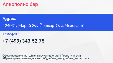 Алкополис, бар по адресу 424031, Марий Эл, Йошкар-Ола, Чехова, 61 в дальнейшем Организация, размещена в следующих категориях: