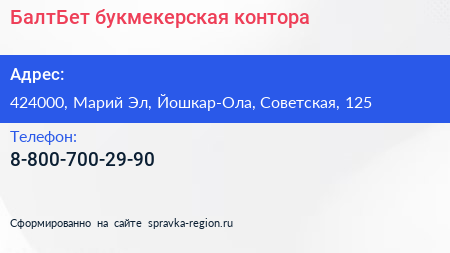 БалтБет, букмекерская контора по адресу 424000, Марий Эл, Йошкар-Ола, Советская, 125 в дальнейшем Организация, размещена в следующих категориях: