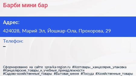 Барби, мини-бар по адресу 424028, Марий Эл, Йошкар-Ола, Прохорова, 29 в дальнейшем Организация, размещена в следующих категориях: