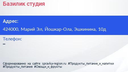 Базилик, студия по адресу 424000, Марий Эл, Йошкар-Ола, Эшкинина, 10д в дальнейшем Организация, размещена в следующих категориях: