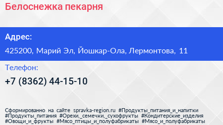 Белоснежка, пекарня по адресу 425200, Марий Эл, Йошкар-Ола, Лермонтова, 11 в дальнейшем Организация, размещена в следующих категориях: