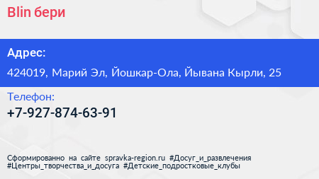 Blin бери по адресу 424019, Марий Эл, Йошкар-Ола, Йывана Кырли, 25 в дальнейшем Организация, размещена в следующих категориях: