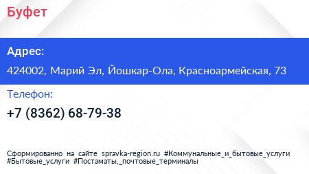 Буфет по адресу 424002, Марий Эл, Йошкар-Ола, Красноармейская, 73 в дальнейшем Организация, размещена в следующих категориях: