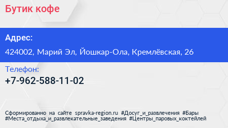 Бутик кофе по адресу 424002, Марий Эл, Йошкар-Ола, Кремлёвская, 26 в дальнейшем Организация, размещена в следующих категориях: