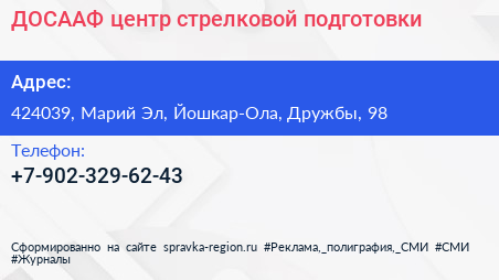 ДОСААФ, центр стрелковой подготовки по адресу 424039, Марий Эл, Йошкар-Ола, Дружбы, 98 в дальнейшем Организация, размещена в следующих категориях: