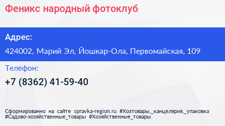 Феникс, народный фотоклуб по адресу 424002, Марий Эл, Йошкар-Ола, Первомайская, 109 в дальнейшем Организация, размещена в следующих категориях: