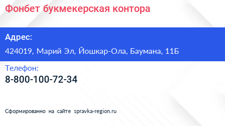 Фонбет, букмекерская контора по адресу 424019, Марий Эл, Йошкар-Ола, Баумана, 11Б в дальнейшем Организация, размещена в следующих категориях: