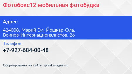Фотобокс12, мобильная фотобудка по адресу 424008, Марий Эл, Йошкар-Ола, Воинов-Интернационалистов, 26 в дальнейшем Организация, размещена в следующих категориях:
