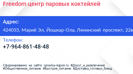 Freedom, центр паровых коктейлей по адресу 424033, Марий Эл, Йошкар-Ола, Ленинский проспект, 22в в дальнейшем Организация, размещена в следующих категориях: