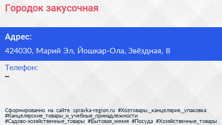 Городок, закусочная по адресу 424030, Марий Эл, Йошкар-Ола, Звёздная, 8 в дальнейшем Организация, размещена в следующих категориях:
