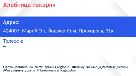 Хлебница, пекарня по адресу 424007, Марий Эл, Йошкар-Ола, Прохорова, 31а в дальнейшем Организация, размещена в следующих категориях: