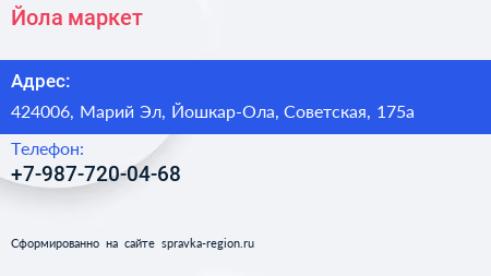 Йола-маркет по адресу 424006, Марий Эл, Йошкар-Ола, Советская, 175а в дальнейшем Организация, размещена в следующих категориях:
