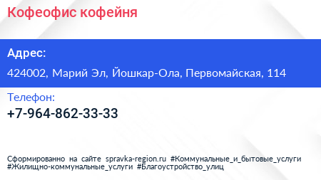 Кофеофис, кофейня по адресу 424002, Марий Эл, Йошкар-Ола, Первомайская, 114 в дальнейшем Организация, размещена в следующих категориях: