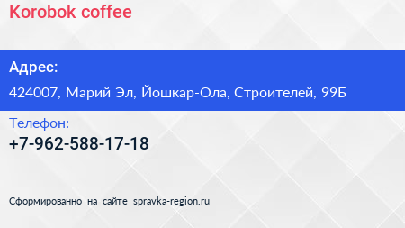 Korobok coffee по адресу 424007, Марий Эл, Йошкар-Ола, Строителей, 99Б в дальнейшем Организация, размещена в следующих категориях: