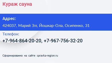 Кураж, сауна по адресу 424037, Марий Эл, Йошкар-Ола, Осипенко, 31 в дальнейшем Организация, размещена в следующих категориях: