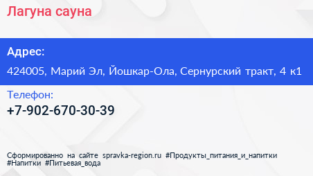 Лагуна, сауна по адресу 424005, Марий Эл, Йошкар-Ола, Сернурский тракт, 4 к1 в дальнейшем Организация, размещена в следующих категориях: