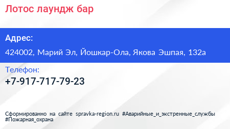 Лотос, лаундж-бар по адресу 424002, Марий Эл, Йошкар-Ола, Якова Эшпая, 132а в дальнейшем Организация, размещена в следующих категориях:
