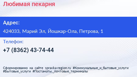 Любимая пекарня по адресу 424033, Марий Эл, Йошкар-Ола, Петрова, 1 в дальнейшем Организация, размещена в следующих категориях: