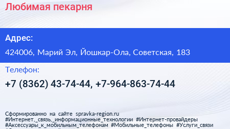Любимая пекарня по адресу 424006, Марий Эл, Йошкар-Ола, Советская, 183 в дальнейшем Организация, размещена в следующих категориях:
