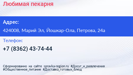 Любимая пекарня по адресу 424008, Марий Эл, Йошкар-Ола, Петрова, 24а в дальнейшем Организация, размещена в следующих категориях: