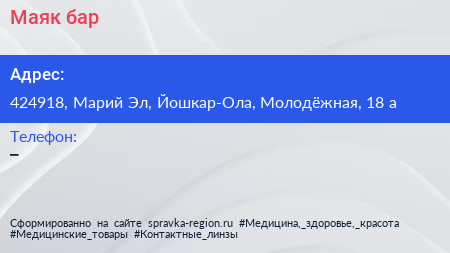 Маяк, бар по адресу 424918, Марий Эл, Йошкар-Ола, Молодёжная, 18 а в дальнейшем Организация, размещена в следующих категориях: