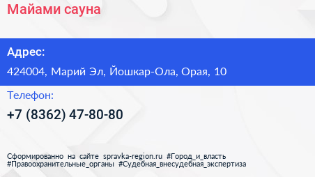 Майами, сауна по адресу 424004, Марий Эл, Йошкар-Ола, Орая, 10 в дальнейшем Организация, размещена в следующих категориях: