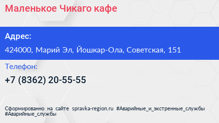 Маленькое Чикаго, кафе по адресу 424000, Марий Эл, Йошкар-Ола, Советская, 151 в дальнейшем Организация, размещена в следующих категориях:
