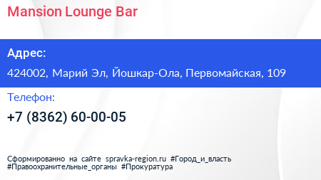 Mansion Lounge Bar по адресу 424002, Марий Эл, Йошкар-Ола, Первомайская, 109 в дальнейшем Организация, размещена в следующих категориях: