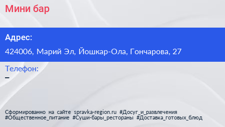 Мини-бар по адресу 424006, Марий Эл, Йошкар-Ола, Гончарова, 27 в дальнейшем Организация, размещена в следующих категориях: