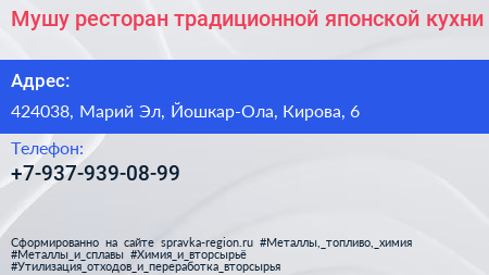 Мушу, ресторан традиционной японской кухни по адресу 424038, Марий Эл, Йошкар-Ола, Кирова, 6 в дальнейшем Организация, размещена в следующих категориях: