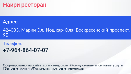 Наири, ресторан по адресу 424033, Марий Эл, Йошкар-Ола, Воскресенский проспект, 9Б в дальнейшем Организация, размещена в следующих категориях:
