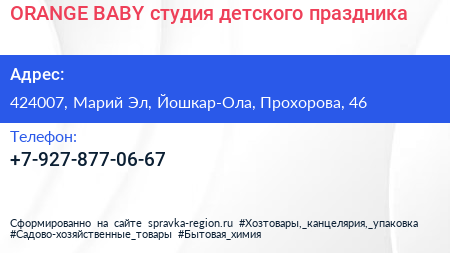 ORANGE BABY, студия детского праздника по адресу 424007, Марий Эл, Йошкар-Ола, Прохорова, 46 в дальнейшем Организация, размещена в следующих категориях: