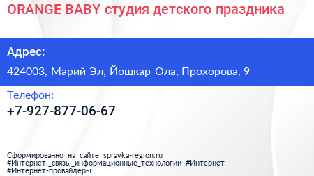ORANGE BABY, студия детского праздника по адресу 424003, Марий Эл, Йошкар-Ола, Прохорова, 9 в дальнейшем Организация, размещена в следующих категориях: