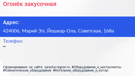 Огонёк, закусочная по адресу 424006, Марий Эл, Йошкар-Ола, Советская, 168а в дальнейшем Организация, размещена в следующих категориях: