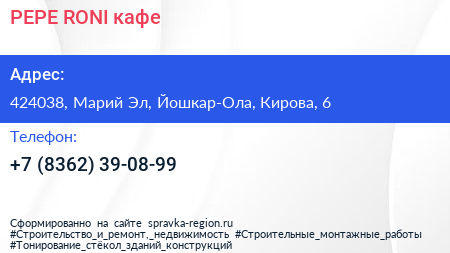 PEPE & RONI, кафе по адресу 424038, Марий Эл, Йошкар-Ола, Кирова, 6 в дальнейшем Организация, размещена в следующих категориях: