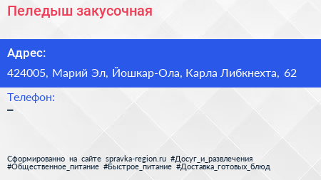 Пеледыш, закусочная по адресу 424005, Марий Эл, Йошкар-Ола, Карла Либкнехта, 62 в дальнейшем Организация, размещена в следующих категориях: