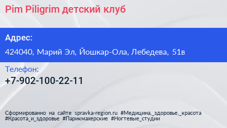 Pim Piligrim, детский клуб по адресу 424040, Марий Эл, Йошкар-Ола, Лебедева, 51в в дальнейшем Организация, размещена в следующих категориях: