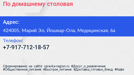 По-домашнему, столовая по адресу 424005, Марий Эл, Йошкар-Ола, Медицинская, 6а в дальнейшем Организация, размещена в следующих категориях: