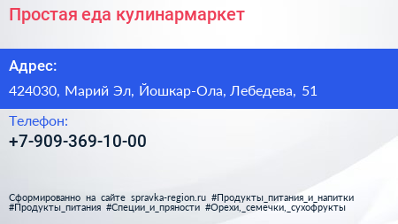 Простая еда, кулинармаркет по адресу 424030, Марий Эл, Йошкар-Ола, Лебедева, 51 в дальнейшем Организация, размещена в следующих категориях: