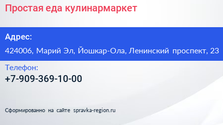 Простая еда, кулинармаркет по адресу 424006, Марий Эл, Йошкар-Ола, Ленинский проспект, 23 в дальнейшем Организация, размещена в следующих категориях: